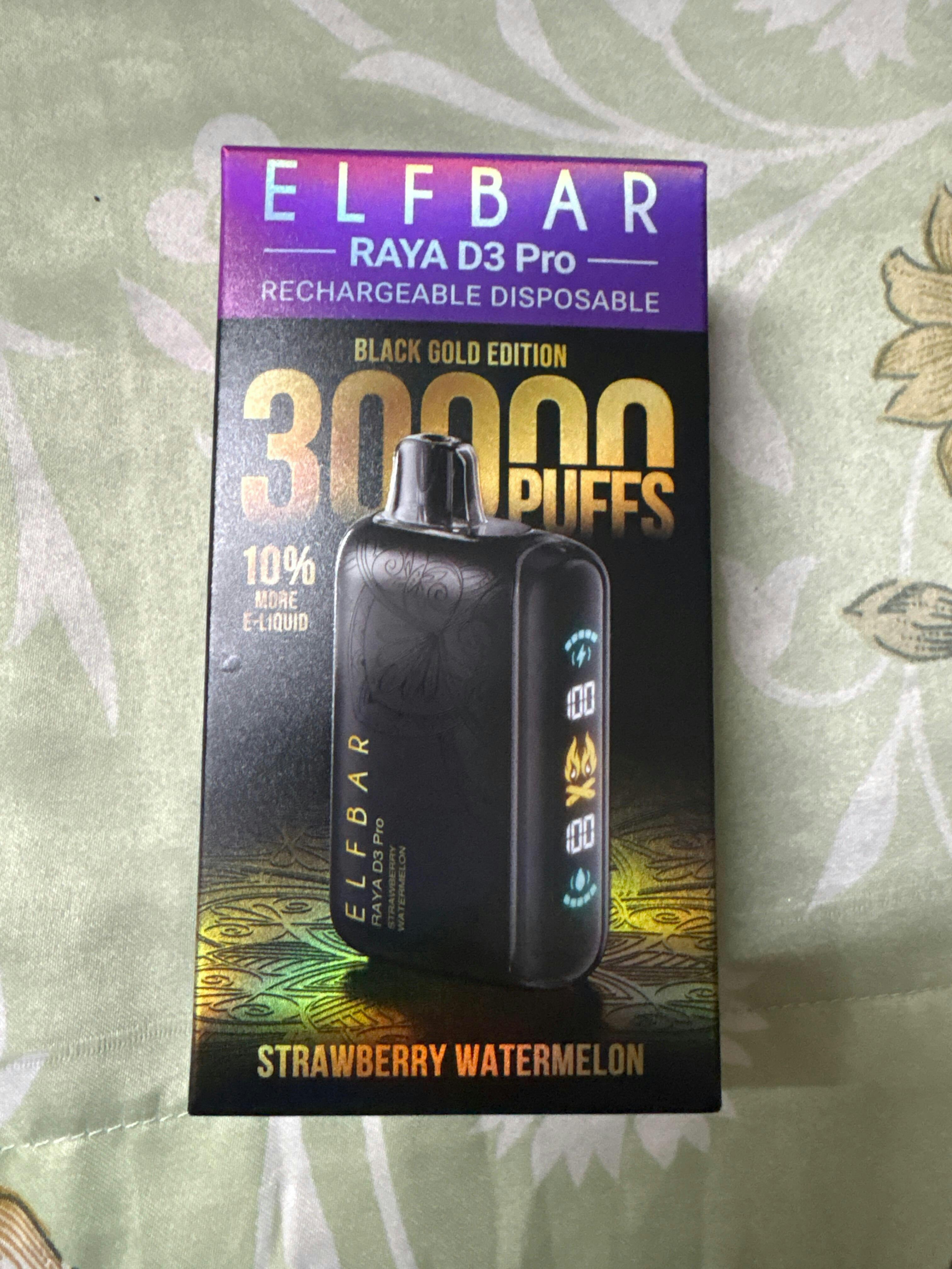 ElfBar Raya D3 Pro Vape device enhances its beauty with its color combination of black and gold edition.